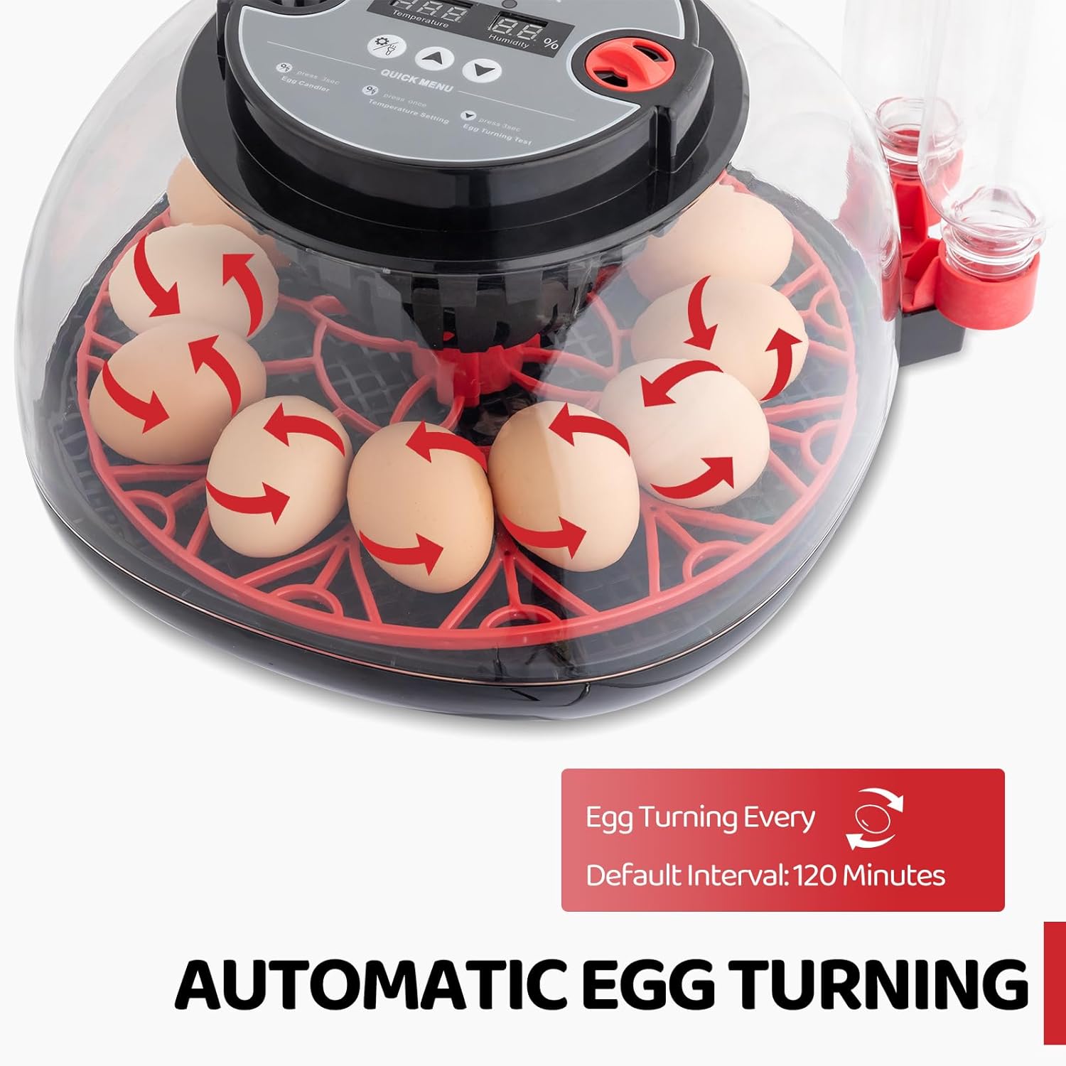 Introductions: This 12-egg incubator has dual temperature and humidity displays, can accurately control temperature, and has automatic egg turning and LED egg lighting functions. It has two water filling holes for easy and automatic water replenishment, and can distinguish the water filling range during the incubation period and the hatching period. With it, you can free your hands. This highly transparent top cover design allows you to observe the incubation process easily. Its air vent design allows fresh air to circulate inside the machine.Feature: [Egg Candling] The egg incubator has a built-in candlelight that allows you to easily monitor the incubation process and egg condition over the 21 days. [Automatic Refill] Opening the lid during the incubation process can cause fluctuations in temperature and humidity inside the incubator, so this incubator comes with two independent water bottles1.Material: PET2.Color: Black,Red3.Power: 35w4.Voltage: 110V5. Capacity: It can hold up to 12 chicken/duck eggs or 24 quail eggs.(Capacity Changes According to the Type of Egg)6.Net Weight:1.63kg/3.59lbs7. Product Size: 12" x 12.4" x 7.68" (L x W x H)8.Adjustable temperature range: 86(℉)-103.1(℉)Package Includes:1x Incubator1x Spray Bottle1x Power Cord2x water bottle1x User ManualKind tips:1. The Hatching Eggs Must Be Fresh, Forbidden to Be Placed in the Refrigerator, or Washed with Water. and the Best-fertilized Eggs Are Within 4-7 Days After Laying.2. The Large Round End of the Egg Must Be Facing Upwards, While the Small Round End Must Be Downwards When the Egg Is Put into the Machine for Incubation.3. Do Not Turn the Eggs Three Days Before the End of Incubation. Stop Turning the Eggs After 18 Day