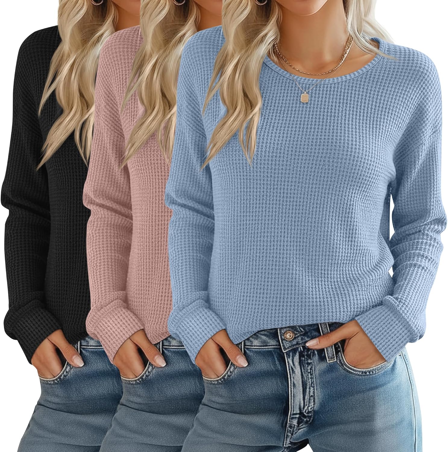 Features: Size selection: Please check our size chart before you place order for comfortable wearing. Clothing maintenance: Machine washable or hand wash with cold water. Do not bleach / Lay flat to dry / Do not iron at high temperature. Material: 65% Cotton, 30% Polyester, 5% Spandex Package includes: 3 x Women's waffle knit long sleeve shirts Notes: Manual measurement, please allow slight errors on size. The color may exist a slight difference due to different screen displays