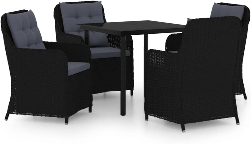 Enjoy a nice meal or afternoon tea in your outdoor space with this patio dining set! Featuring an elegant design, it will become the focal point of your garden and patio!The practical outdoor dining set has a steel frame, making it strong and sturdy. The garden chairs are made of water-resistant and maintenance-free PE rattan, making them perfect for outdoor use. The ergonomically-designed shape and thickly-padded, removable cushions with foam filling will provide the ultimate seating comfort. The low-maintenance polyester cushion and pillow covers can be easily removed and washed. In addition, the smooth glass tabletop is easy to clean with a damp cloth and excellent for placing meals, drinks and other decorative items.Note: In order to extend the life of your outdoor furniture, we recommend you to clean it regularly and do not leave it outdoors without protection unnecessarily.Clean: Use a mild soap solution.Storing: If possible, store in a cool, dry place indoors. If the product is stored outdoors, protect it with a waterproof cover. Wipe and dry the excess water or snow from flat surfaces after a rain or snowfall. Allow sufficient air circulation to avoid moisture-related damage.TableColor: BlackMaterial: Powder-coated steel, glassDimensions: 31.5" x 31.5" x 29.1" (L x W x H)Chair:Chair color: BlackCushion color: Dark grayChair material: PE rattan, powder-coated steelCushion material: 100% polyesterChair dimensions: 25.2" x 25.6" x 35.4" (W x D x H)Seat width: 21.3"Seat depth: 19.3"Seat height from the ground without cushion: 16.1"Armrest height from the ground: 21.3"Weather-resistantAssembly required: YesDelivery contains:1 x Table4 x Chair4 x Seat cushion4 x Back cushion