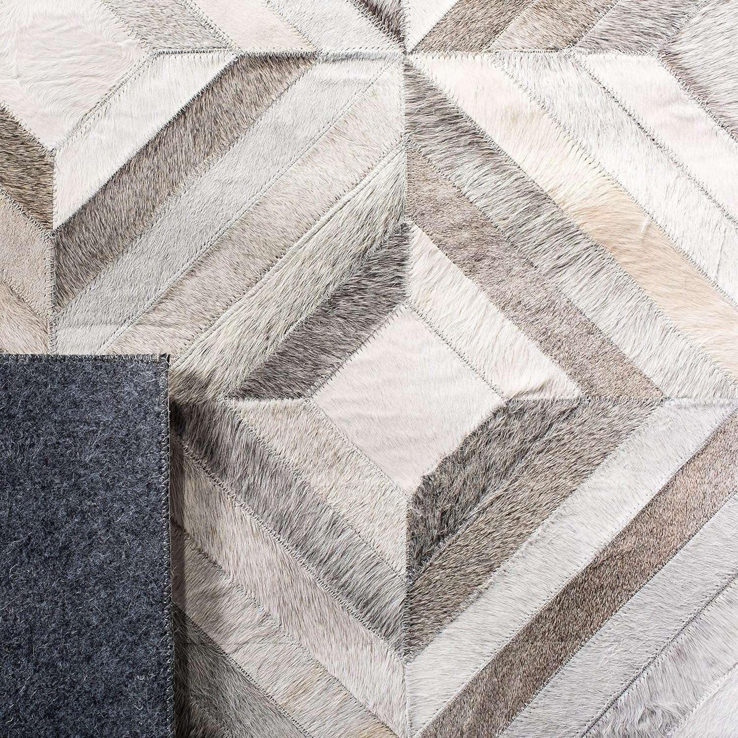Transform your home into a luxurious space with the REGAL RUGS 5x8 ft Genuine Cowhide Leather Rug, designed to add a premium touch of sophistication and style. This handmade patchwork area rug is meticulously crafted from 100% authentic cowhide leather, ensuring natural durability, softness, and unique texture that elevates your interior décor instantly. The geometric patchwork pattern in elegant grey tones blends beautifully with modern, rustic, and contemporary interiors. Whether you’re enhancing your living room, bedroom, hall, office, or entryway, this rug creates a stunning visual centerpiece while offering everyday functionality. Each piece of cowhide is carefully selected and stitched into a flat weave design, creating a smooth surface that’s perfect underfoot—ideal for both style and comfort. The ultra-soft texture, coupled with its low-pile structure, ensures that it's easy to clean, resistant to dust and shedding, and suitable for high-traffic areas. This rug works equally well in indoor settings like living rooms or bedrooms, and outdoor-inspired zones like sunrooms or patios (under shade). Its 5x8 ft large size makes it a bold statement rug for large spaces, and the natural variations in cowhide give every rug a one-of-a-kind charm. Whether you're going for a western, boho, minimal, or luxury home décor style, this rug perfectly blends into your aesthetic. Add timeless charm and sustainable craftsmanship to your home with this eco-conscious cowhide leather carpet — a perfect blend of nature, art, and comfort. Great for gifting or personal use, REGAL RUGS delivers handmade excellence with lasting impact.