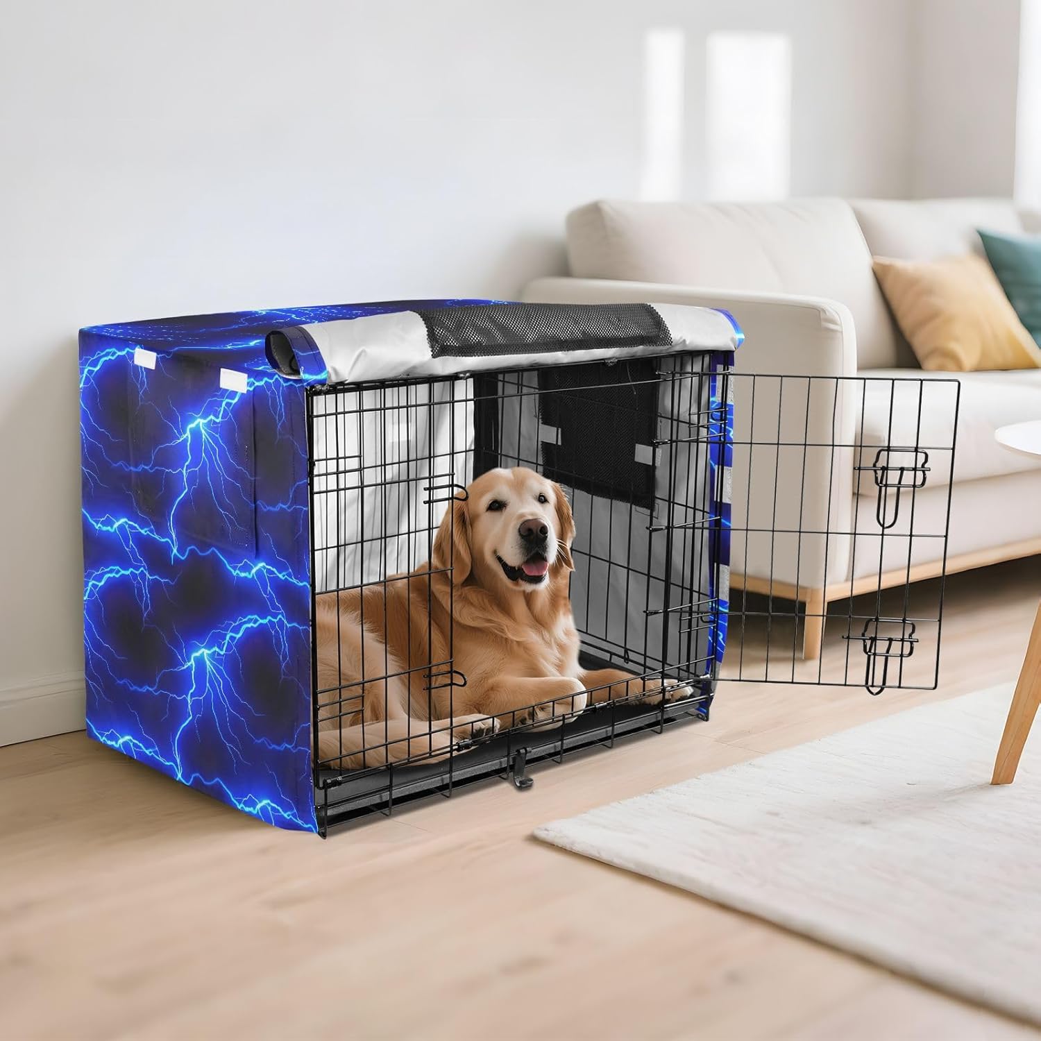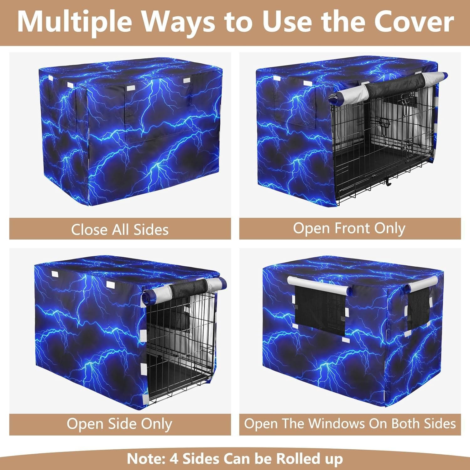 Weather-Resistant Dog Crate Cover is made of 600D silver-coated oxford fabric that provides exceptional protection against wind, rain, and sunlight. This material prevents your pet from scratching the crate and blocks most direct sunlight, ensuring a safe and comfortable space.Simple and Secure Setup features an easy fastening system, making it effortless to install without the need for tools. This breathable pet cage cover fits securely onto your dog crate, ensuring it stays in place and provides protection at all times.Ventilation for Comfort with mesh windows on all sides, our dog kennel cover ensures optimal airflow, keeping your pet cool and comfortable even during long periods inside the crate. The mesh design also provides privacy and security for your pet.Wind-Resistant and Stable with four adjustable tie-down straps at the bottom, this indoor pet crate cover stays securely in place, preventing it from being blown away by the wind or removed unintentionally. This feature ensures that your pet’s crate remains stable and protected.Versatile Use Ideal for both indoor and outdoor settings, this crate cover provides the protection your pet needs in various environments, whether at home or on the go. The compact design makes it easy to store and travel with.