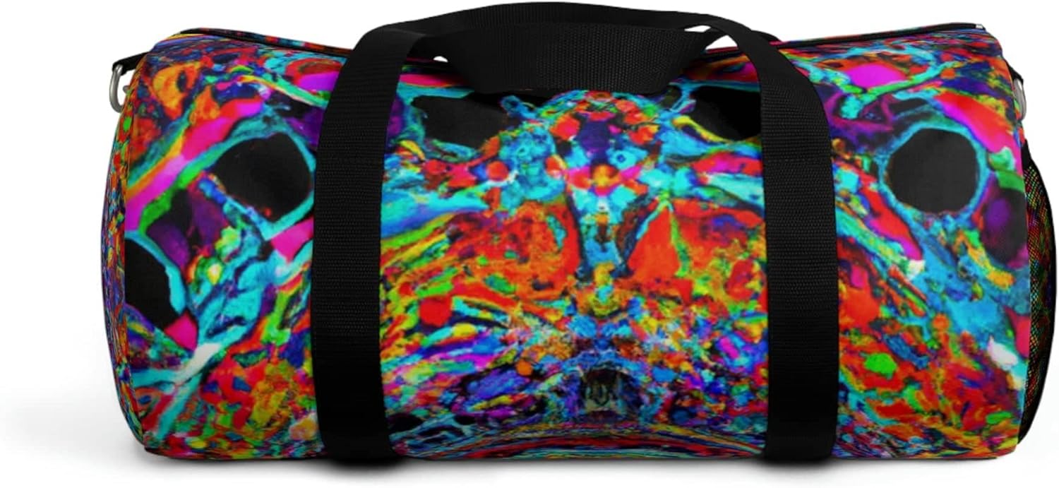 This gorgeous duffel bag features an intricate, colorful mandala and is perfect for anyone looking to add a unique touch to their look. With sturdy fabric and charming detail, you won't be disappointed. The mandala design is sure to be a conversation piece! Show off your yoga mat, laptop, and more while looking stylish and making a statement. Pick up yours today and make a bold fashion statement! #mandala #durablefabric #fashionstatement #stylishbag #uniquedesign #yogamatbag #laptopbag #eye-catchingmandala #vividmandala #colormandala #sturdybag
