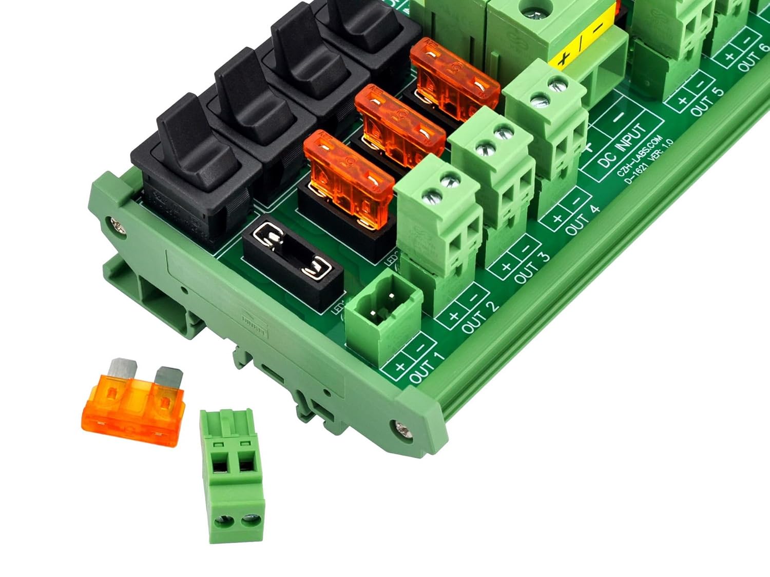 1, Operating voltage DC 5 to 32V. Total rated current 52 Amps. Paddle switch. Pluggable side wiring terminal block. 2, Input: Rated current 52 Amps. Dual input screw terminal block, the direction of the input terminal wiring can be flexibly selected, and it can also be extended to other modules as its input source. Pitch 10.16mm/0.4", wire range 20 - 6AWG / 10mm square, strip length 10mm, screw - metric M4. 3, Output: Maximum current 5 Amps for per channel (the factory-installed fuse is 5 amps. If the fuse is replaced, the maximum current can be up to 10 amps). Pluggable terminal block, pitch 5.08mm/0.2", wire range 28 - 12AWG / 2.5mm square, stripping length 7mm, screw - metric M2.5 slotted. 4, Each output terminal is equipped with an independent switch, which can flexibly control the power supply of each load device. 5, Each output terminal is equipped with an independent fuse, which can protect the power supply of each load device and are not affected by each other. Medium blade ATO fuse. The fuse holder supports fuse replacement, making fuse replacement easy. 6, Each output terminal is equipped with a green LED power indicator. The indicator light comes on when power is on and goes off when the switch is off or the fuse fails. 7, High quality fireproof nylon material DIN rail mount carrier, can support width 35mm, 32mm or 15mm rail. A pair of DIN rail to Wall mounting adapter brackets are also included, which will support wall or wood panel mounting. 8, UL CE CQC certified terminal blocks. UL 94-V0 certified PCB, and UL CE certified DIN rail mount carrier. UL certified fuse holder and fuse. UL CE certified switch.