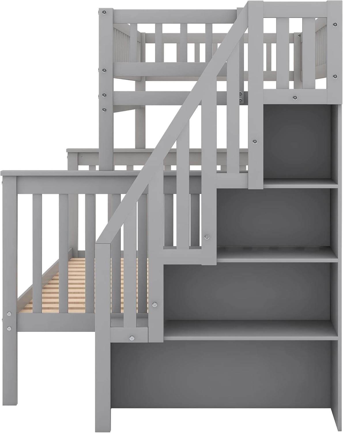 We welcome you to shop with us. Our greatest desire is your satisfaction. If you have any problems, Please feel free to contact us. We will try our best to ensure your satisfaction. This twin over full bunk beds features timeless styling that will last for years and is also easily converted into two individual beds for versatility. This great space saving bed is the perfect solution for a growing family. Features: 1. Include two sizes bed 2. Have shelves on the side 3. Can be divided into two separate beds Dimension: Bed Size: Twin Over Full Top bed: 76''x 37.7'' Under bed: 76.3''x54.5'' Top bed recommended mattress thickness: 6'' Under bed recommended mattress thicknes: 6-8'' Frame Material: Pine Wood Box Spring Required: No Mattress Included: No Assembly Required: Yes Product Warranty: 1 Year Slat Kit Included: Yes Weight Capacity Bottom Bed: 200 lb. Weight Capacity Top Bed: 200 lb. Package 1: 56.69 * 29.72 * 4.53 in. 52.91 lbs. Package 2: 56.5 * 17.13 * 6.5 in. 94.8 lbs. Package 3: 80.51 * 12.6 * 6.69 in. 62.83 lbs.