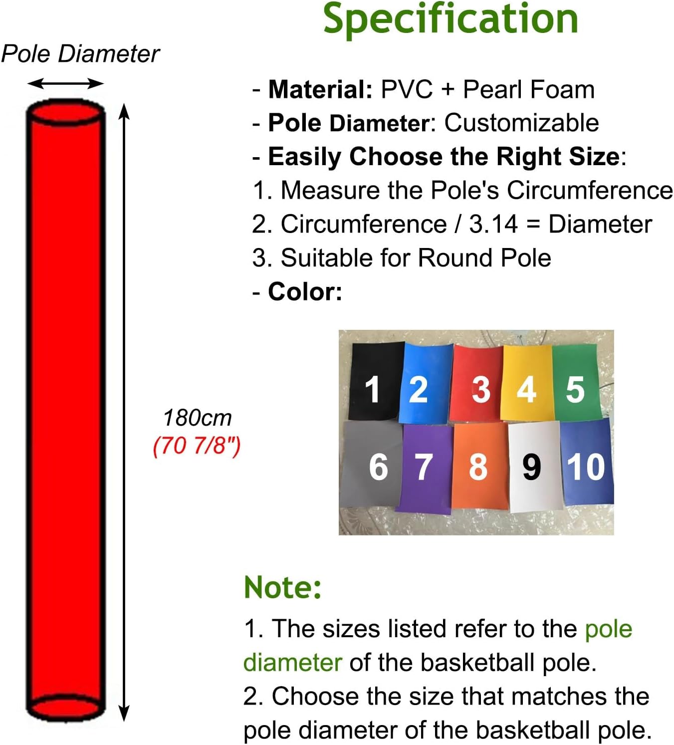 Gym Basement Pole Wrap Protection Barrier:Are you looking for a dependable basketball pole padding protector to enhance safety during play? Our basketball pole padding wrap is specifically designed to minimize injuries from unexpected contact while providing excellent protection for your pole against daily wear and tear. This innovative pole padding helps reduce the risk of injury during intense gameplay, including dunks and blocks. By providing a cushioned barrier, it protects players from potential collisions with the pole, safeguarding heads, arms, and bodies during every game. **Specifications:** - **Material:** Durable PVC + Pearl Foam - **Height:** 180cm (70 7/8") - **Customization:** Available in various pole diameters and colors **Features:** - **Easy Installation:** Strong allows for quick setup without any tools. - **360° Protection:** The fully wrapped design ensures comprehensive impact protection from all angles. - **High-Quality Materials:** Made from wear-resistant PVC that maintains its shape over time. - **Weather Resistant:** UV-resistant and waterproof, perfect for outdoor use throughout the year. - **Impact Absorption:** High-density foam effectively absorbs shocks, significantly lowering the risk of injury. **Package Includes:** - 1 x Basketball Pole Padding **Important Notes:** - Please allow for slight dimension variations due to manual measurements. - Colors may vary slightly from the images due to lighting and screen settings. **Customer Support:** We are committed to your satisfaction. If you have any questions or concerns regarding your purchase, please reach out to us. We are dedicated to providing excellent service and ensuring you have the best experience with our product!