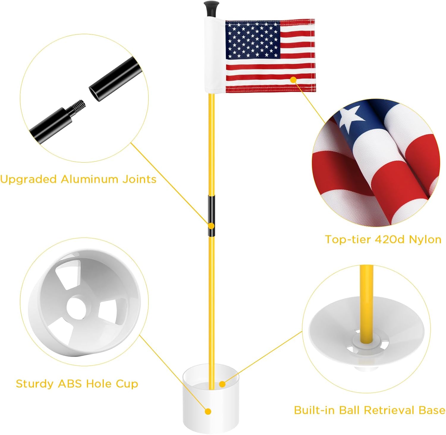 Turn any outdoor space into a personal golf course with the KINGTOP Portable Golf Hole Digger & Flagstick Set! Designed for golf enthusiasts who love DIY practice greens, this bundle combines precision hole digging with a professional-quality flagstick to create the ultimate backyard golf experience. The carbon steel blade hole digger, featuring blackened, heat-treated durability, makes it effortless to dig PGA/USGA standard holes. With pre-marked depth indicators, you can accurately create 4-inch or 6-inch holes. The detachable wooden handle ensures comfortable grip, easy storage, and portability, making it perfect for home practice greens, garden golf, and even outdoor tournaments. The 2-piece golf flagstick is designed for easy assembly and transport, featuring a painted finish and a ball-retrieving base, so you'll never have to bend down to pick up your ball again. The high-visibility 6"x8" nylon flag is made from engineering-grade 420D fabric, ensuring bright, fade-resistant colors for long-lasting outdoor use. The ABS golf hole cup, crafted to R&A/USGA standards, includes three drainage holes to keep it dry and clean in any weather. Perfect for backyards, gardens, golf parties, and travel, the KINGTOP Portable Golf Hole Digger & Flagstick Set allows you to create your own mini golf course anytime, anywhere. Whether practicing alone or enjoying golf with friends and family, this set brings the game to you!