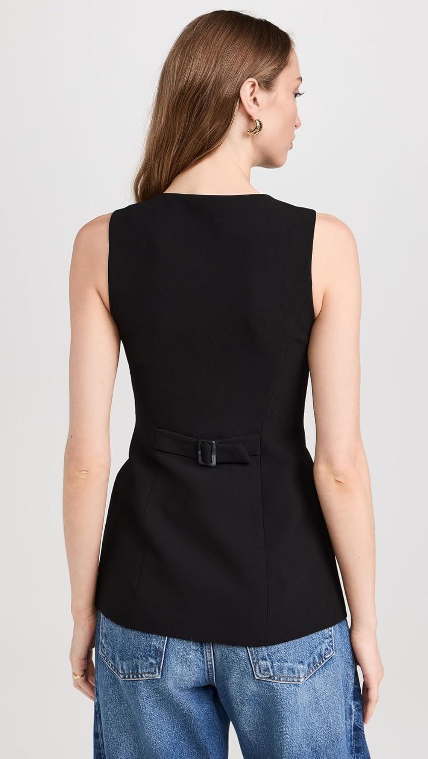 The classic waistcoat makes a comeback, crafted from textured boucle fabric. This longline waistcoat features a defined silhouette with a waist slit, ideal for pairing with high-waisted bottoms. An adjustable back buckle ensures a more fitted look, while button-up fastening and a curved crew neckline complete the design. Sleeveless, with a front length of 69cm in size 10 (measured from side neck point to hem).