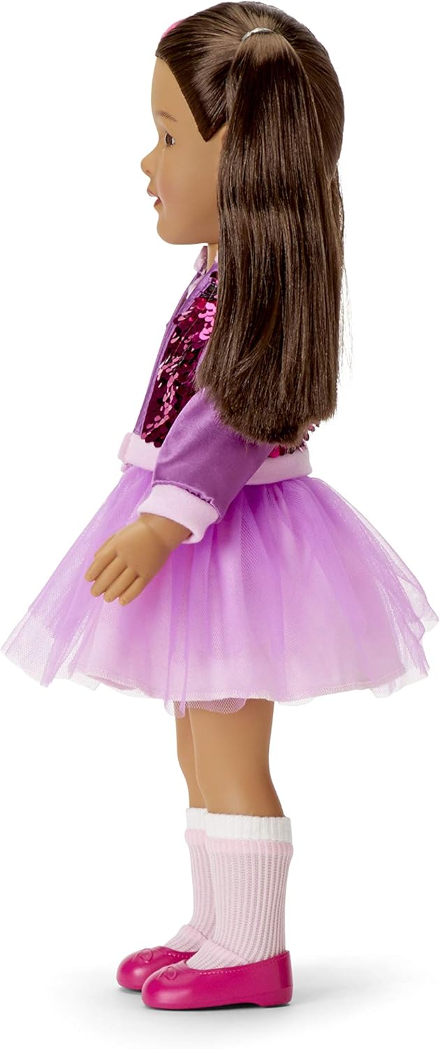 Kindness Club - Rosa - Medium Skin/Hazel Eyes/Brunette Hair Meet the Kindness Club, girls with big hearts and big dreams to make the world a better place, teaching caring and respect for all people.These 14” dolls have molded, poseable bodies, beautiful rooted hair with a colorful highlight, realistic fixed eyes, and engaging outfits.Dressed in a lilac tutu skirt, striped tee, satin/sequin jacket, and knee socks with bright pink flats. Hair is long, in pigtails, and is brunette with a fun pink highlight!Engage your child in imaginative play with this doll, teaching kindness and empathy.Doll wipes clean with damp cloth.Shipped in a window box. Recommended for ages 3 and up.Features medium skin, hazel eyes; and brunette hair with pink highlight.