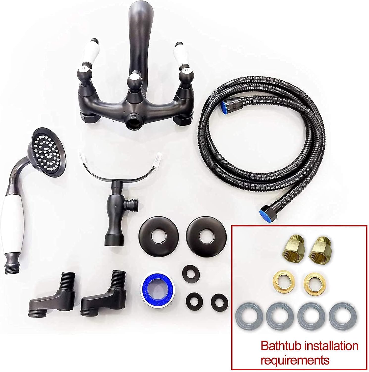 Product description Modern bathroom shower faucet is for wall mounted installation, has matte black finish to resist corrosion and tarnishing for the whole faucet. Matte black bathroom bathtub shower faucet is for wall mounted installation,resist corrosion and tarnishing for the whole faucet, has hand held spray and white handle, suitable pore size is adjustable between 13cm-17cm.8’’ Shower System Details: Material:Brass Color:Matte Black Finish:Matte Black Function:3-Functions Installation:Wall mount,2 holes Top Shower Size:8 inch Round Showerhead Hole Center Distance: 150mm(6 inch) Adjustable Hole Distance:5 inch - 6.6 inch (13cm-17cm) Shower Hose:150cm(59 inch)Clawfoot Bathtub Details: Material:brass Color:Matte Black Installation:Wall mount,2 holes Spray hose:145cm(57") Weight: 2.45kg(5.39 pounds) Shower head diameter: 8cm(3.1") Spout reach:11 cm(4.3’’)