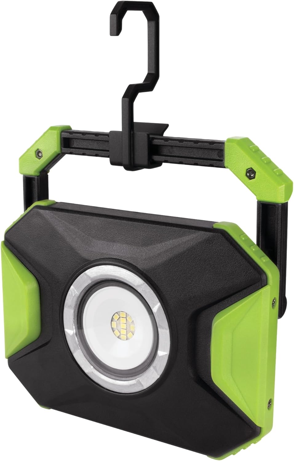 Produces over 1200 lumens of bright white light. LED technology means unit stays cool enough to touch. Pivoting handle can be used as a stand or hanging/carrying and includes a snap-on hook. Wide angle LEDs distribute large flood beam of light. Specs: 1206 lumens on high, 606 lumens on low, 2 hour runtime on high, 4 hour runtime on low. Battery indicator and 5V @ 2A input/output power, 4400mAh li-ion batteries, 3-4 hour charge time. Assembled dimensions: 4.75 high x 1.5 deep x 7.5 in. wide.