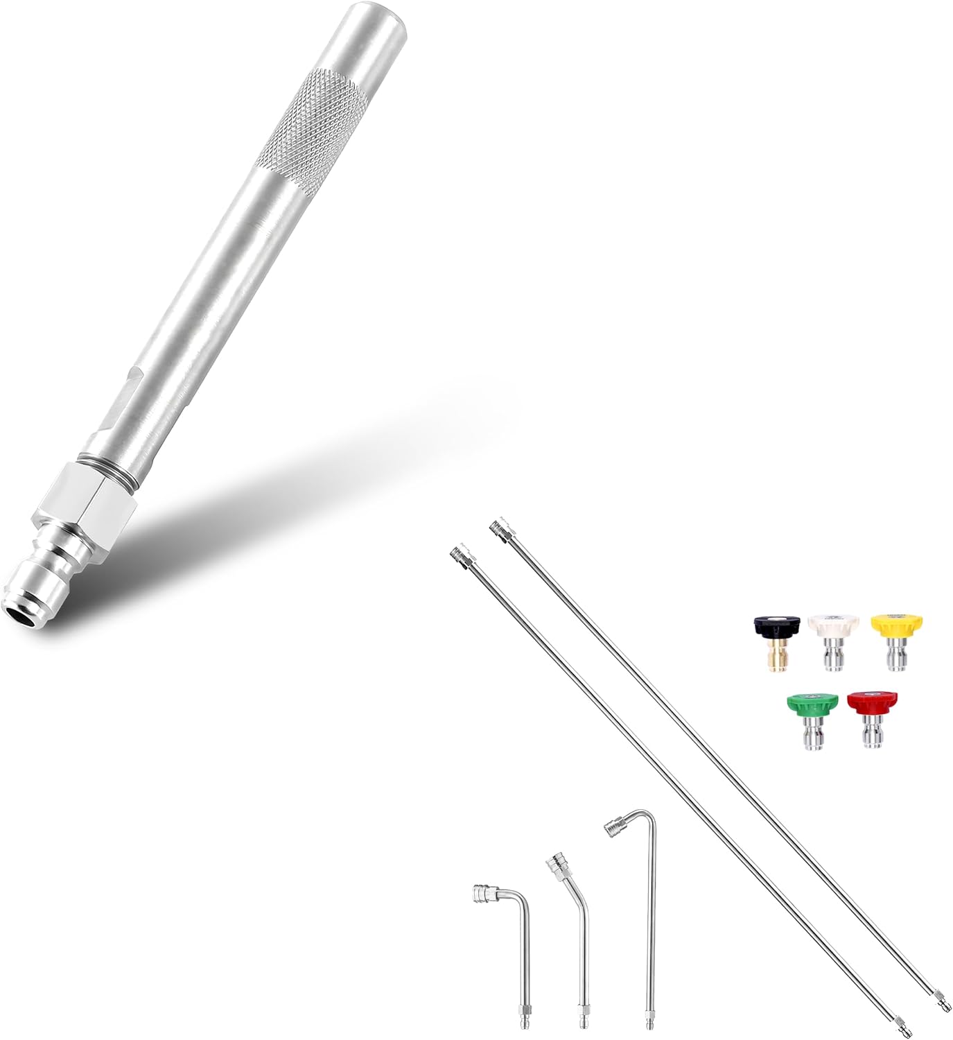 Superior Performance: Built from corrosion-resistant stainless steel, this high pressure nozzle withstands rigorous use with chemicals and pressures up to 6000 PSI. Its durable construction ensures reliable operation whether you're cleaning roofs, driveways, or other challenging surfaces. Effortless 30-Foot Reach: Say goodbye to awkward extension wands - our shooter tip for pressure washer delivers powerful spray streams up to 30 feet when attached directly to your pressure washer gun. Perfect for high or hard-to-access areas with its advanced atomization technology. Universal Compatibility: With a standard 1/4" quick-connect fitting, this high pressure washer nozzle works seamlessly with most pressure washers (3.5-6 GPM). Ideal for both residential and commercial use, from delicate siding washes to heavy-duty concrete cleaning. Extended High-Reach Cleaning: This long reach pressure washer wand extends to 120 inches, providing exceptional access to elevated and confined areas. The pressure washer extension pole eliminates the need for ladders when cleaning gutters, roofs, and high walls, ensuring both safety and efficiency. Industrial-Grade Durability: Constructed from heavy-duty stainless steel and reinforced fittings, this high pressure washer wand resists corrosion, rust, and high-pressure wear. Designed for professional use, it withstands 4000 PSI continuous operation without degradation or leakage.