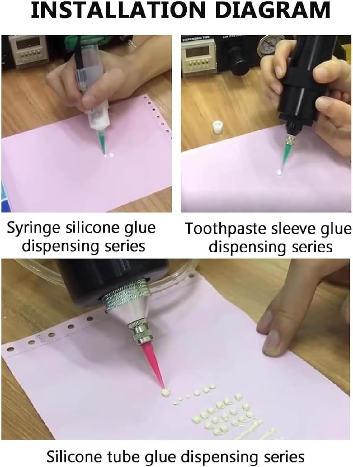 Product parametersProduct name: Silicone glue dispenserSolenoid valve: high-power solenoid valveControl interface: three-core control interfaceTiming duration: 0.01 seconds ~ 99.99 hoursWeight: 2.5 kgApplicable glue: high-viscosity silicone rubber, solder paste, etc.Packing list:330ML silicone dispensing set + side fixing bracket*1Note:1. Due to the different colors of the brightness of the display and the light, the actual color may be slightly different from the picture.2. Due to manual measurement, please allow a 0-2cm error. Thanks for your understanding.