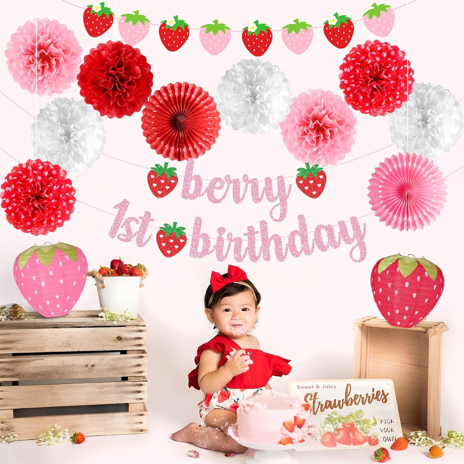 Celebrate your baby girl’s first birthday with this all-in-one strawberry-themed decoration set. Includes a large backdrop, highchair banner, tissue pom poms, and matching photo props—ideal for creating a charming and coordinated party space indoors or outdoors.