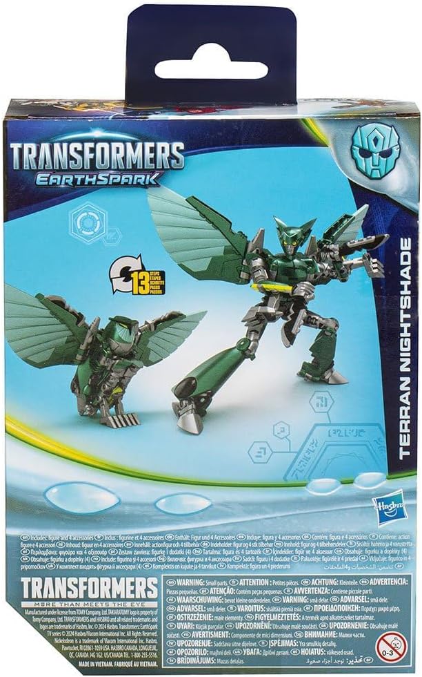 Transformers: EarthSpark introduces a new generation of Transformers robots: the first Transformers robots to be born on Earth. Together with the human family that collected them, they will redefine what it is to be a family. Deluxe class figures bring Transformers robots to life from screen to home! This 12.5 cm Terran Nightshade toy has a classic green decor, as in the Transformers: EarthSpark cartoon. Terran Nightshade converts from robot mode to owl mode in 13 steps. Each Deluxe Class figure includes a Build-a-Figure piece. By combining all the pieces (included with all Deluxe Class figures), one can assemble Dr. Meridian "Mandroid", the villain half-man half robot of the cartoon! Build-a-figure measures 11cm and is non-convertible. (Sold separately, while stocks last.) Transformers and all related characters are trademarks of Hasbro.