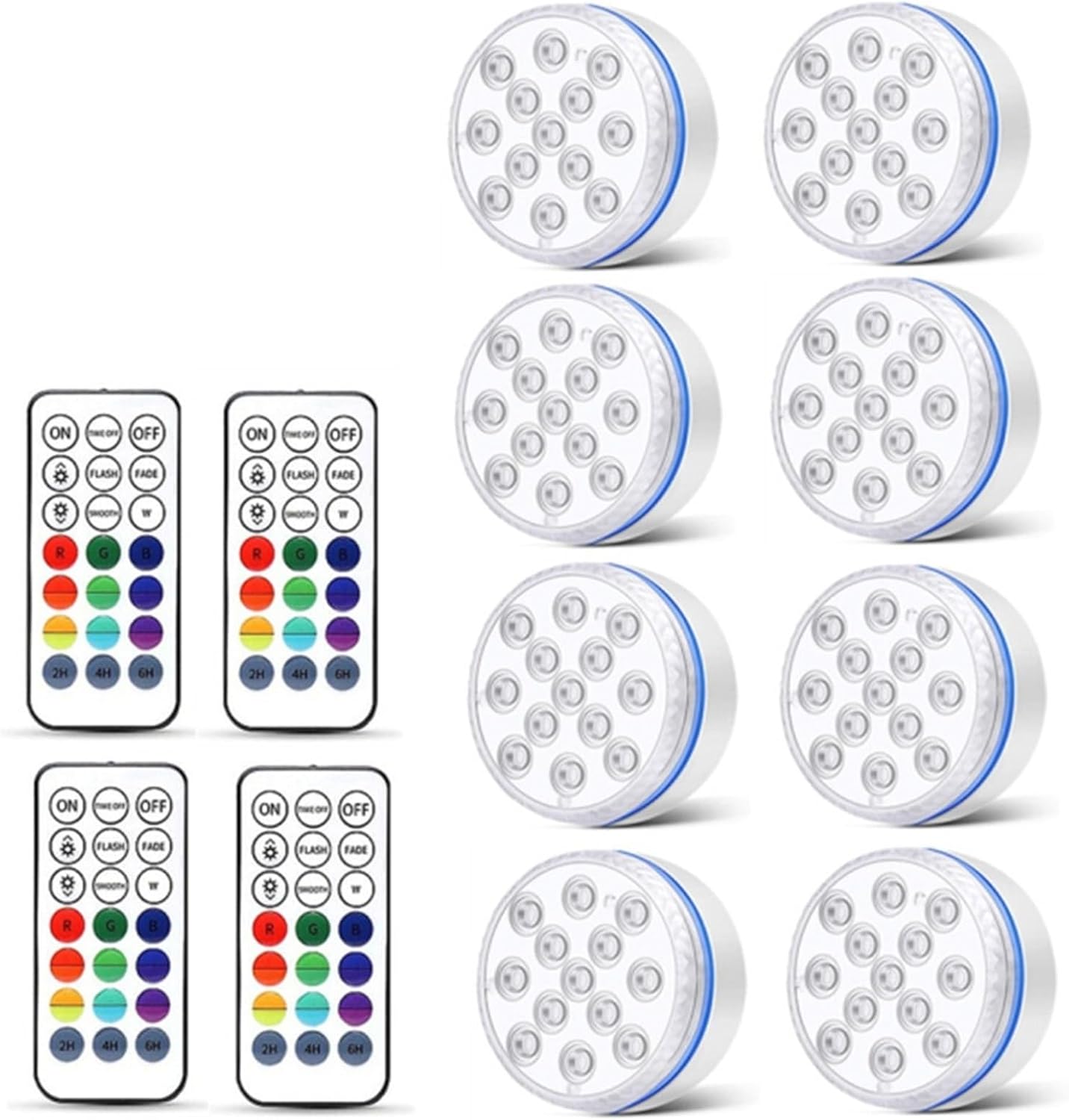 Pond LightsSpecifications1. Super waterproof, IP68.2. Four silica gel suction cups at the bottom, strong adsorption capacity, will not fall off.3. Strong magnet adsorption function, the magnet is not exposed, and it is not easy to rust.4. Use high-performance waterproof ring to increase the appearance and waterproof performance.5. The shell is made of ABS, which is anti-fall and anti-vibration.6.21-key radio frequency remote control, 5m underwater, 20m in the air.7.16 ColorsSize: 7CM,powered by 3*AAA dry battery(not included);8.5CM,powered by 3*AA dry battery(not included)Features:1.Newest Waterproof Submersible LED Lights: This Submersible LED lights is Ture IP68 WaterProof, major point is our double sealing ring protect the light on the outside so it will protect the inside better from getting damp and mouldy. We have 4 suction cups, We also has 1* 5000 Gauss Magnet to increase even more suction. The 4 suction cups are made out of silica gel which makes our product much more . Works well in both Wet or Dry Places.2.Battery and RF Remote: Super bright led submersible powered by 3 x AA/AAA batteries (20-50 Hours Battery Operated LifeSpan). There are Dynamic Modes and Timer Modes of the RF Remote. (Note: The pool water will absorb some signals. The suitable distance range we recommend is 6.6-100ft.3.16 Static Colors, Timer Mode and Dynamic Mode: 16 colors submersible led pool lights have unique 13 color changing beads which will enhance the brightness in a significance level when compare to other submersible lights and enchanting lighting effect to their surroundings.4.Where to Use: The shell of the pool lights for inground pool is very falt and smooth which will reflects the light perfectly. The scaly side edge makes the submersible light itself be adornment. it will creates more romantic atmosphere at wherever you need, such as Pond, Fish tank, Trailer Lights, Waterfall, Tub, Hallway, Garage, Wedding, Event, Party as Decor Lighter Night Light Indoor and Outdoor Decoration.Pictures
