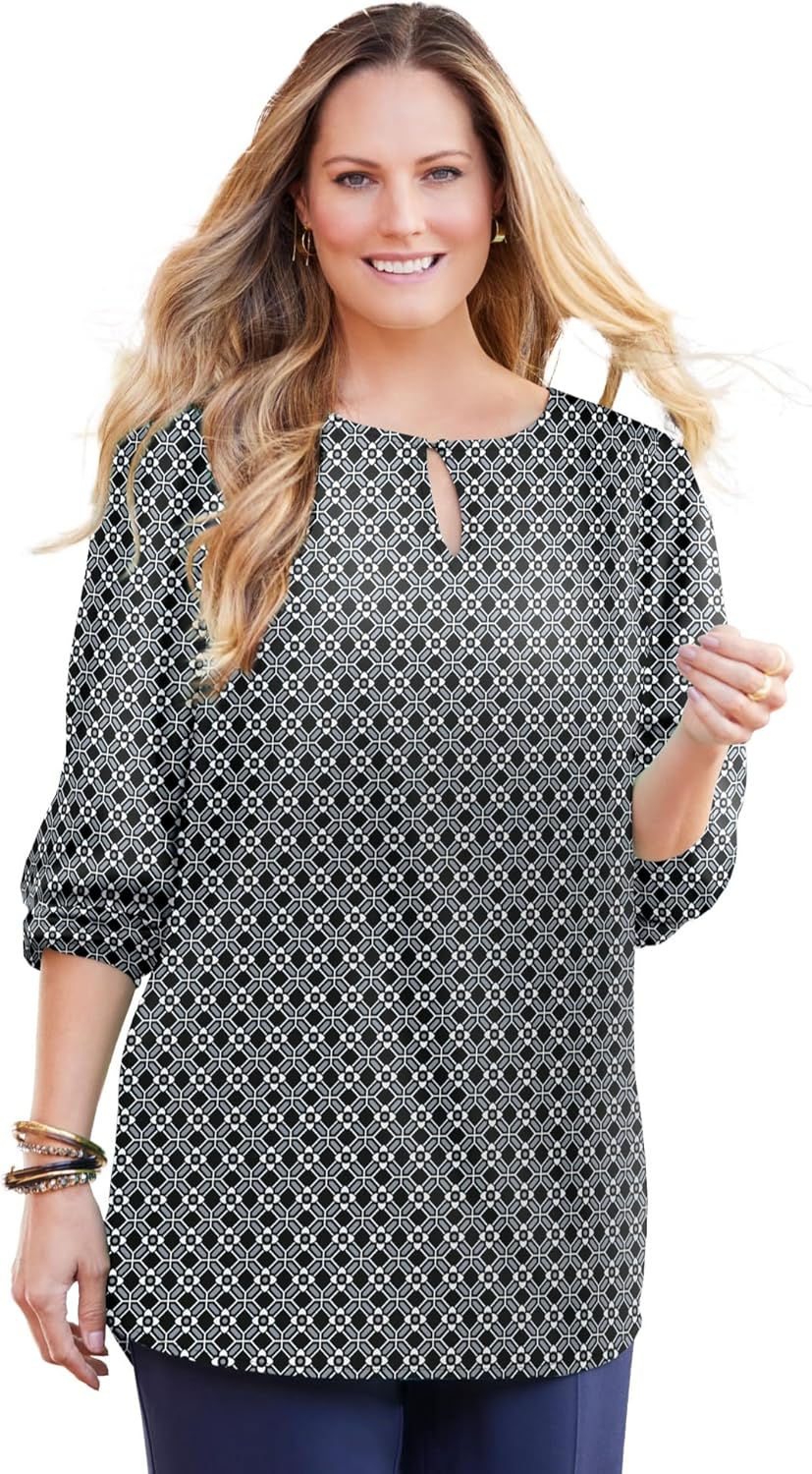 There's always room in your wardrobe for the classics. This keyhole top is no exception, with the timeless silhouette you love made to mix and match with the refined styles of the Liz&Me collection. FABRIC: Lightweight fabric with a slightly crepe texture and a touch of stretch. FIT: Relaxed and easy shape with keyhole at the scoop neckline and peasant ties. Straight hem. 100% Polyesterbr>Machine Washbr>Imported Plus Size Tunicbr>Front Length: 31"br>Plus Sizes 0X-6Xbr>Catherines - Liz&Me